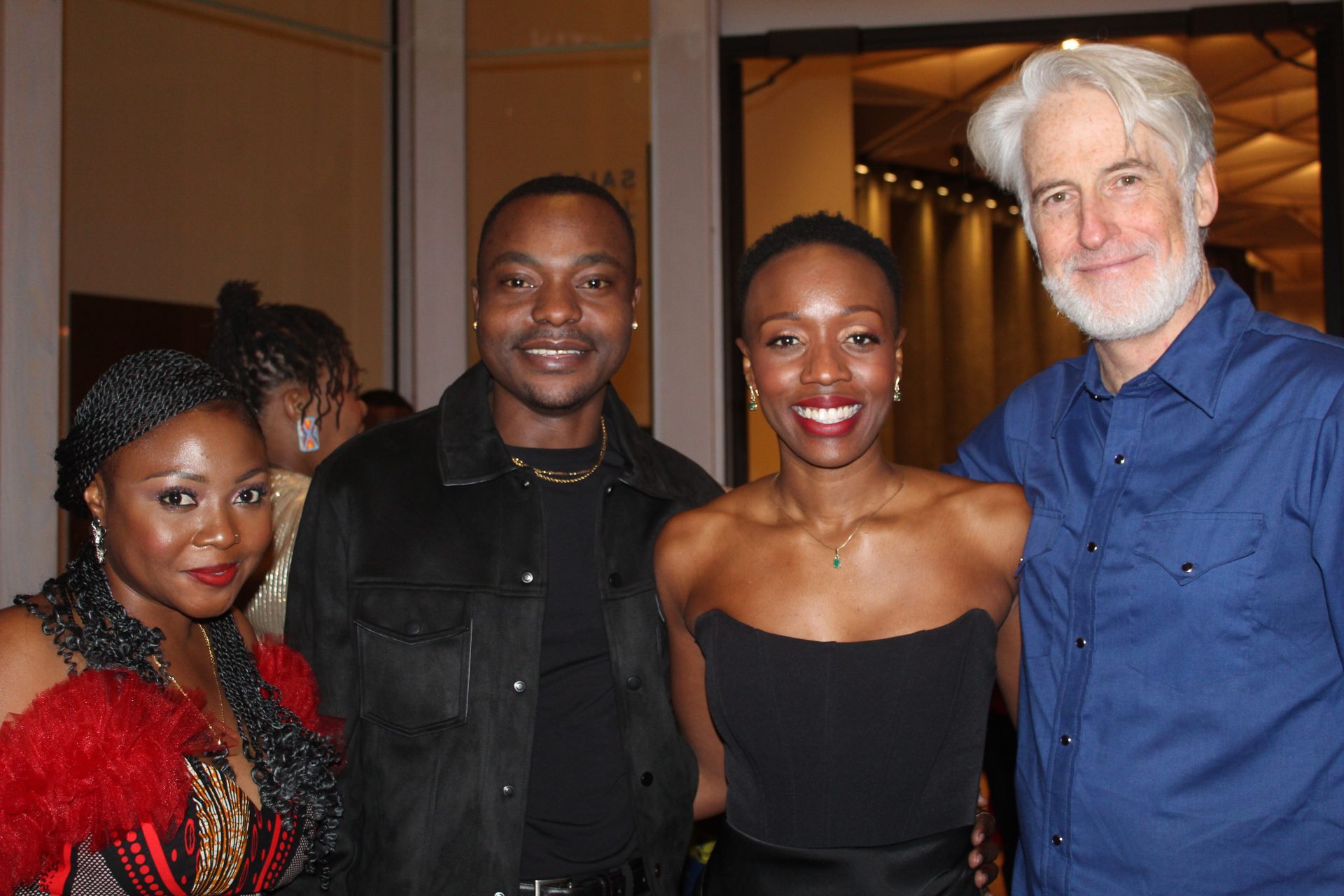 Chiluba Katongo Nsofu, Bemba translator and dialect coach, left; and actors Kondwani Elliott Zulu, Natasha Mumba, and Rick Roberts at the post-performance reception following the world premiere of Mumba's new play Copperbelt at the National Arts Centre on Jan. 15. The Hill Times photograph by Stuart Benson