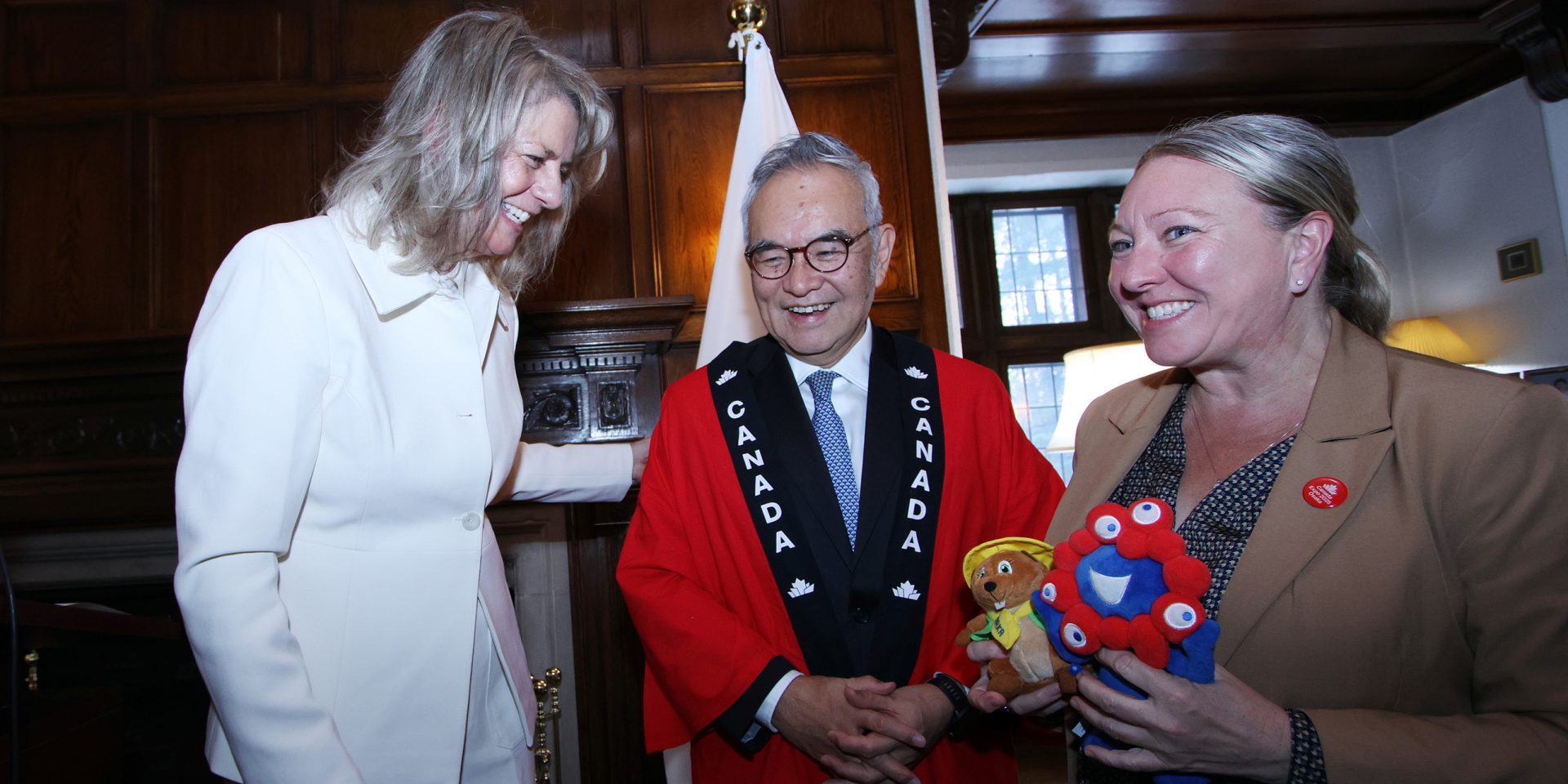 Laurie Peters, commissioner general of the Canada Pavilion, left, Japanese Ambassador Kanji Yamanouchi, and Liberal MP Mona Fortier share a laugh on Jan. 14 at an event at Yamanouchi's official residence. The Hill Times photograph by Sam Garcia
