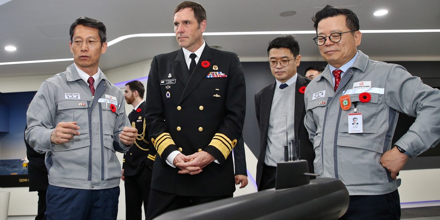 Royal Navy Commander Vice-Admiral Angus Topshee, centre left, views a model of Hanwha Ocean's KSS-III class submarines during a visit to the Okpo Shipyard in South Korea in November 2024. Photograph courtesy of Hanwha Ocean